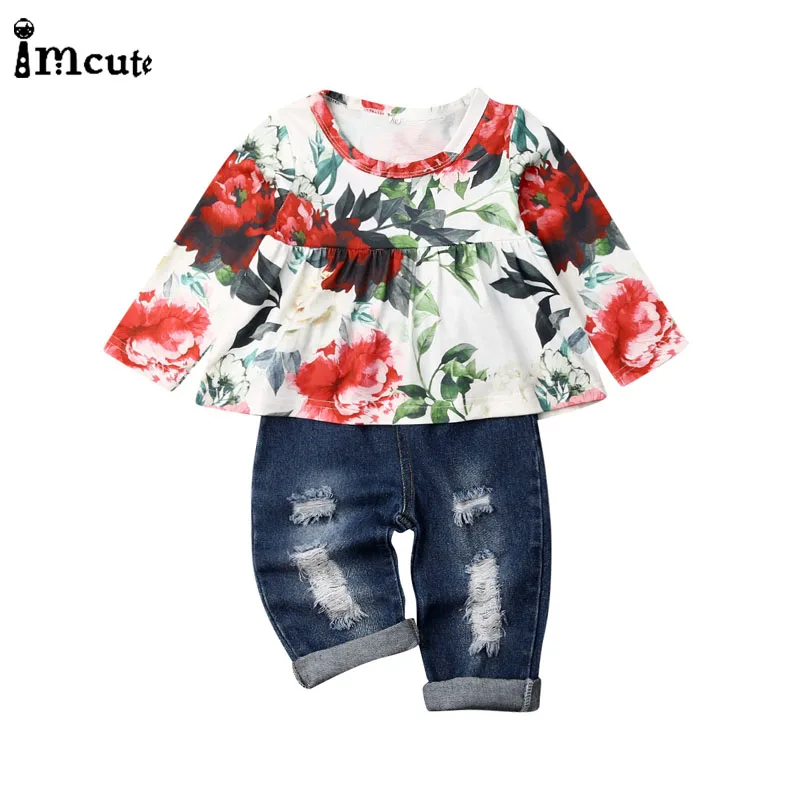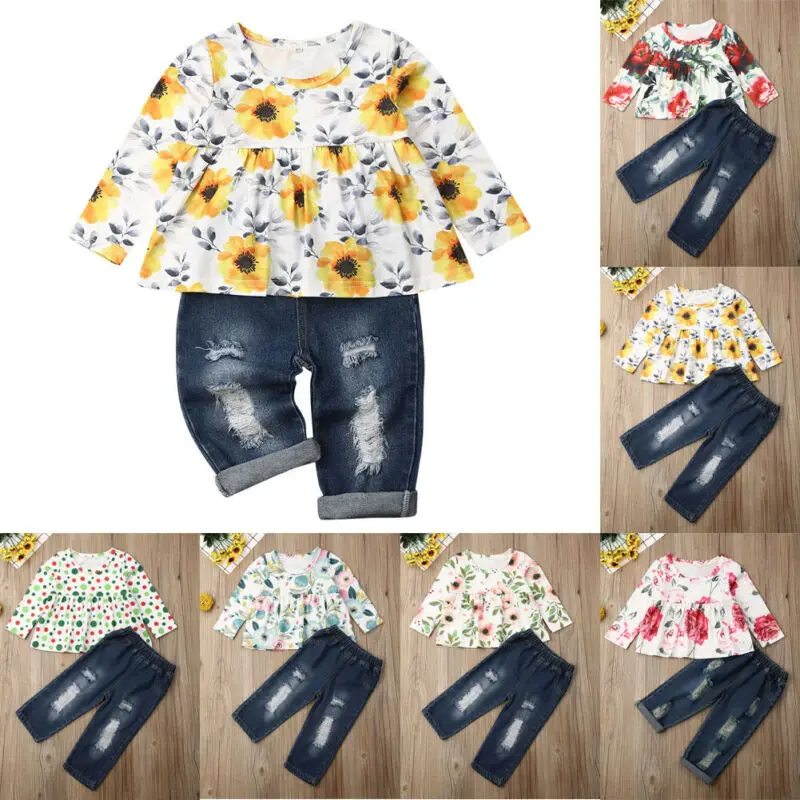 Best Price of 1-6Y Toddler Kid Baby Girl Floral Long Sleeve Tops T-shirt Dress Ripped Denim Pants Holes Jeans Out