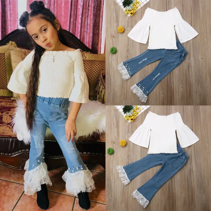 Good Offer of 2pcs Sweet Kids Baby Girls Off Shoulder Shirt +pearl Jeans Pants Outfits Clothes